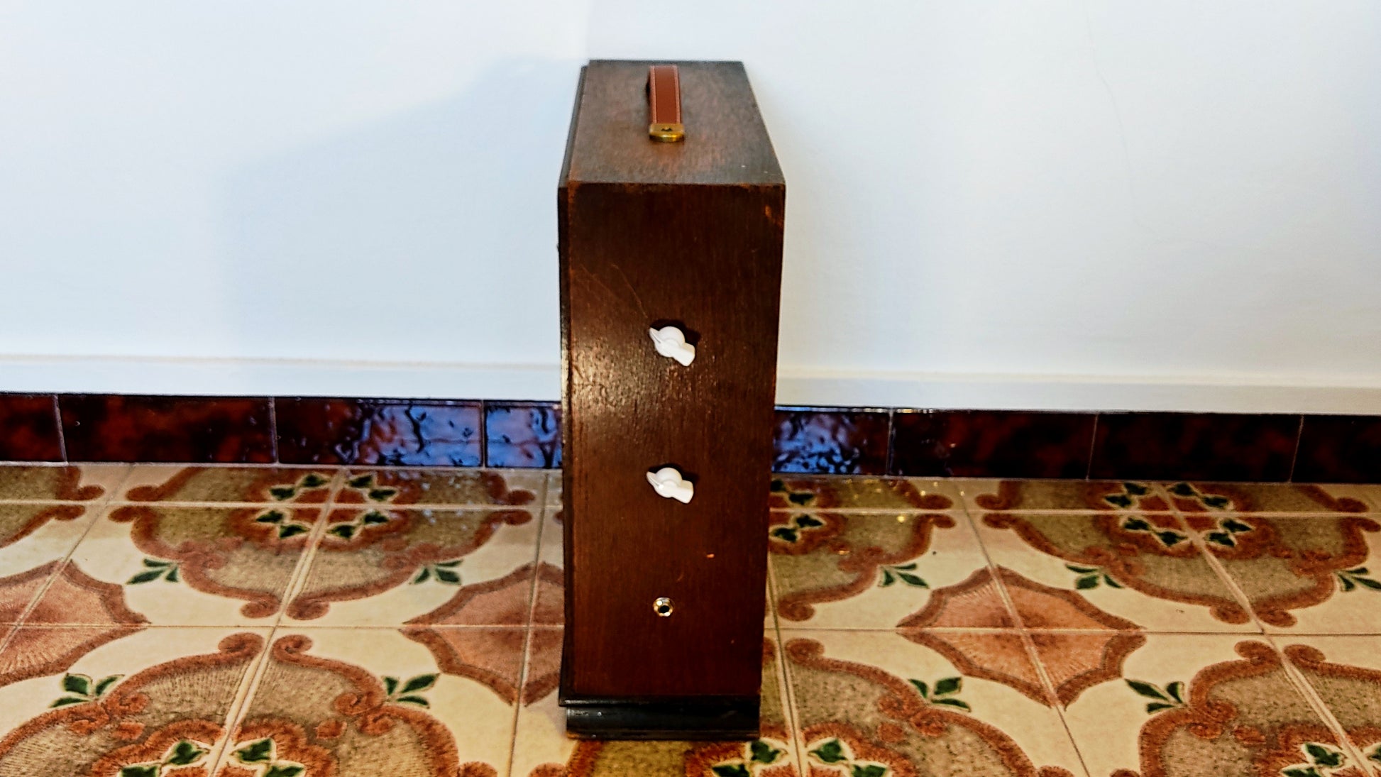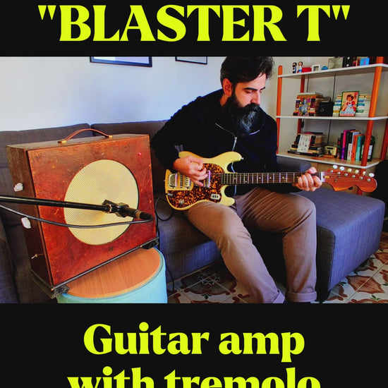 This 1940s wooden casing got paired up with a turntable vintage speaker to blast away some riffs! It sounds as good as it looks! Just check the demo out and you'll see. It has volume and gain controls and the tremolo has speed and dwell controls. It's powered by a 9V battery or a DC adapter (9V, negative center)