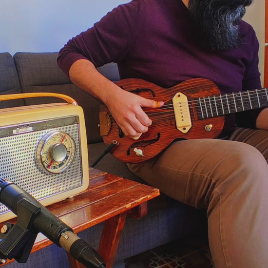 This vintage radio beauty is now a big sounding portable guitar amp! Very balanced response from its original speaker! It delivers very clean tones, but when you turn up the radio dial, you'll open up the gates of rock and roll! The volume control acts as an on/off switch. Check out more info!
