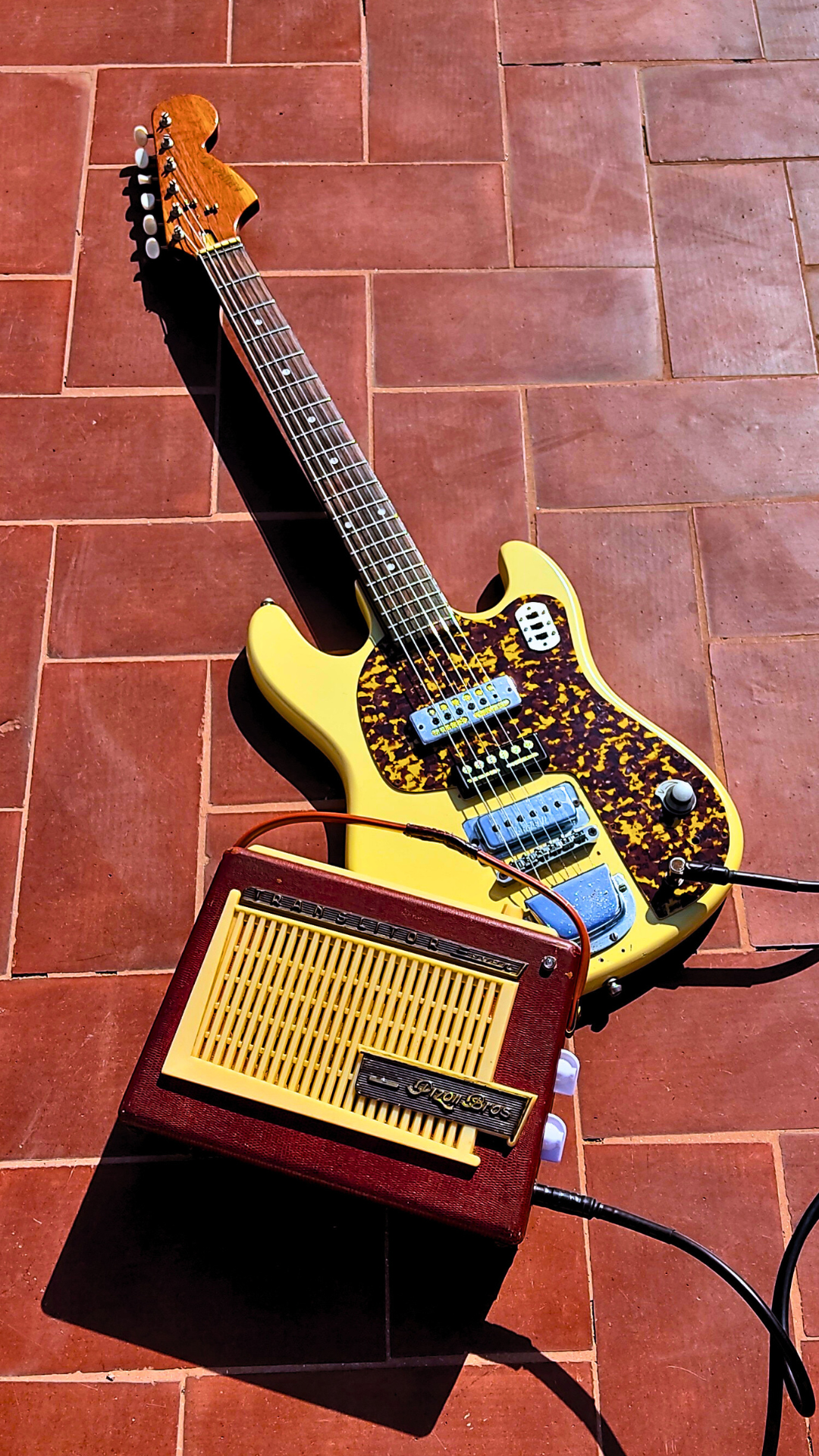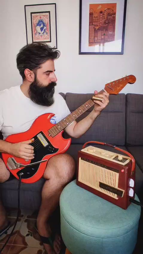 Check out this awesome vintage tone machine! This vintage radio that is now a guitar amp got all the mojo that you could ask for. With its original 7 x 4,5 inch eliptic speaker, it deliver the vintage tones you are looking for, from clean to warm overdrive to a powerfull fuzz. Pushc the button on the top panel and you'll activate the tremolo effect with speed and dwell controls on the side. You wont believe its sound! It's powered by a 9V battery or a DC adapter (9V, negative center)