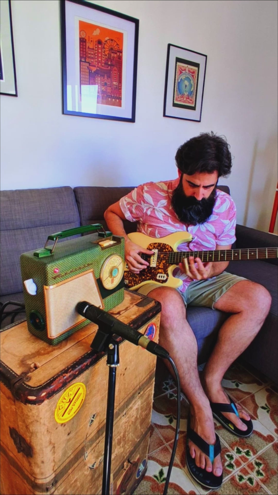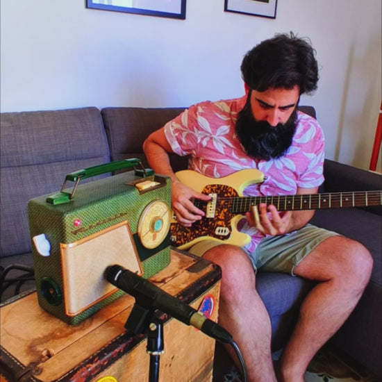 When you talk about vintage sound, you talk about this radio now turned into a guitar amp that sounds incredible. And that's not all, just push the botton on top and you'll activate the tremolo! Volume and gain controls are on the left side and the tremolo controls are the radio dial (speed) and on the right side is the dwell control! Perfect addition to your guitar gear! It's powered by a 9V battery or a DC adapter (9V, negative center)